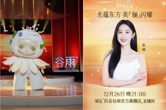 品牌与晚会内容的融入自然而巧妙,品牌人偶谷得白以 “追光小使者” 身份贯穿全程,可爱形象圈粉无数;伴随着音乐会的进程,主持人不仅同步为品牌直播间引流, 还协同嘉宾用花式口播的形式,介绍品牌,推荐产品,精准传递 “更适合中国人肤质” 的核心卖点,将品牌科技实力与文化传承理念深度绑定,让 “国货之光” 的形象深入人心。由此呈现出抖音多元融合的传播体系与持续创新的内容商业化路径,既让传统文化焕活新生触达更多年轻群体,又让谷雨等品牌获得了情感共鸣与品牌曝光的双重收益,实现了文化价值、用户体验与商业效益的三方共赢。